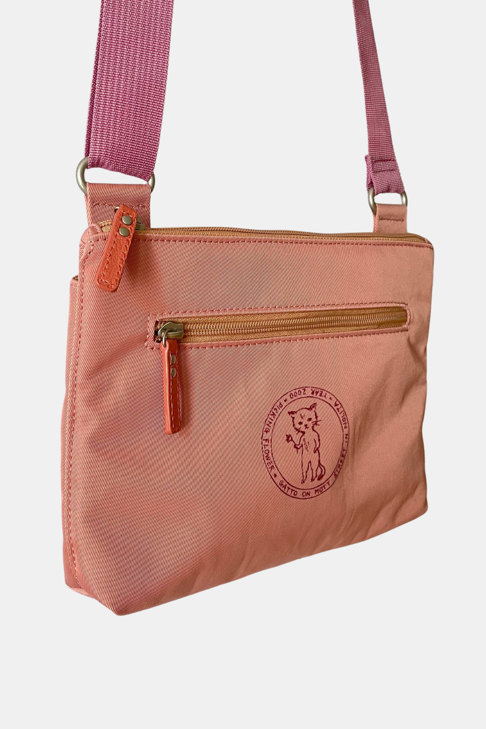 This small shoulder bag with multiple pockets for practical use is made of durable, soft nylon and has a charming cat print accent, along with sophisticated leather zipper accents and an adjustable cross-body shoulder strap. Perfect for everyday wear year-round on any occasion, and guaranteed to serve as your steady companion anywhere you go.